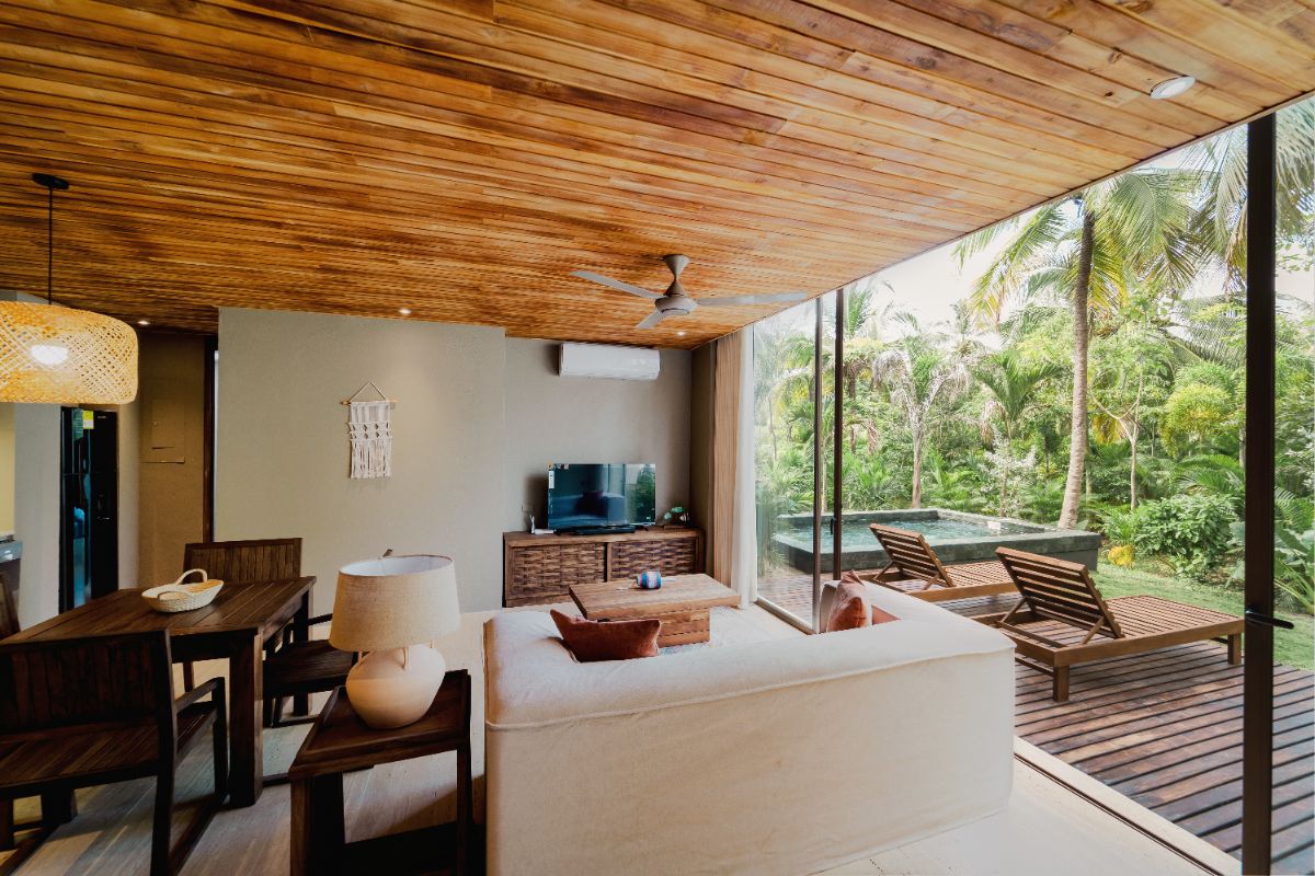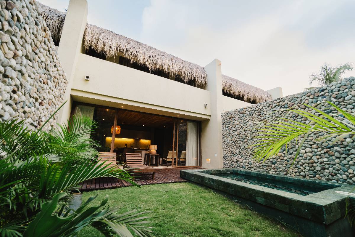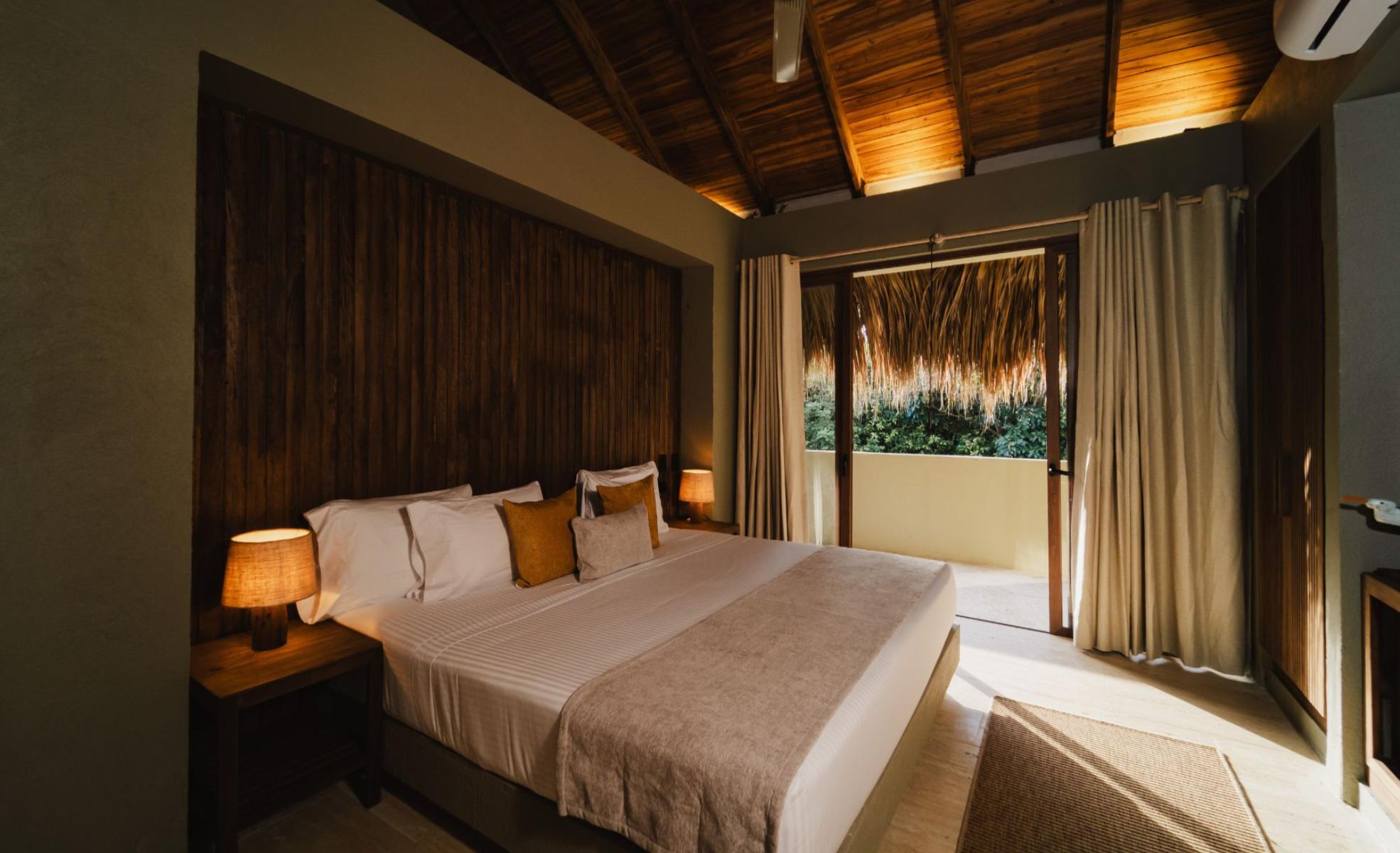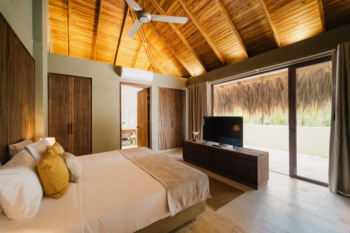 Con 267.8 m2 construidos y 140m2 de terraza exterior privada, con deck de madera, mobiliario, jacuzzi y una amplia piscina, además de un jardín de plantas nativas y tropicales construida con techo de palma. Se distribuye en dos niveles: en el primero, se encuentra una habitación, dotada con dos camas dobles, closet, baño privado, ventilador y aire acondicionado, además de área social con sofá, comedor 8 puestos, baño social, televisor pantalla plana, aire acondicionado, ventilador y amplia cocina dotada. En el segundo nivel está la habitación principal con cama King, televisor pantalla plana, aire acondicionado, ventilador, baño, closet y terraza privada con mobiliario. Adicional a esto, se cuenta con una habitación auxiliar con dos camas dobles, baño, aire acondicionado, ventilador y closet.