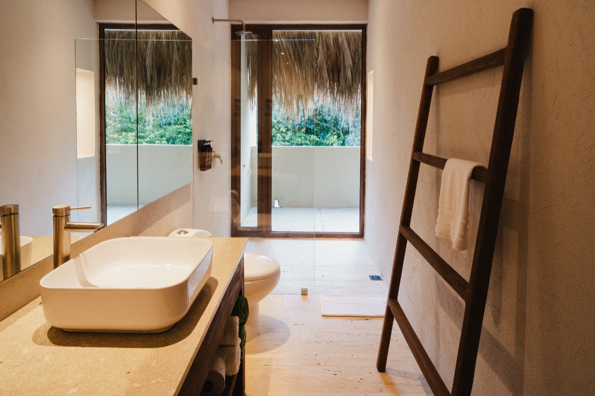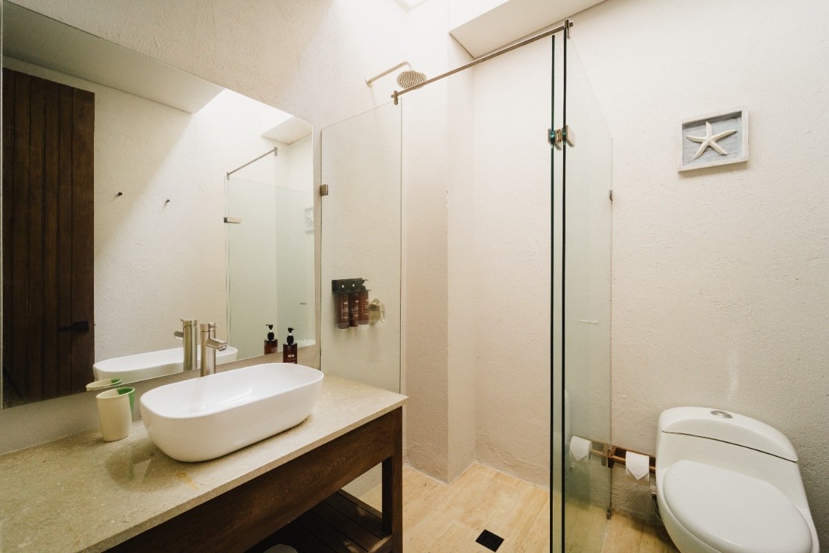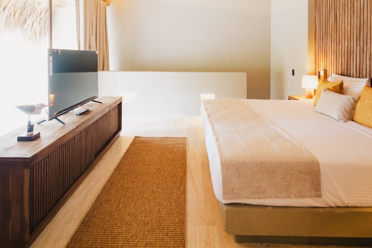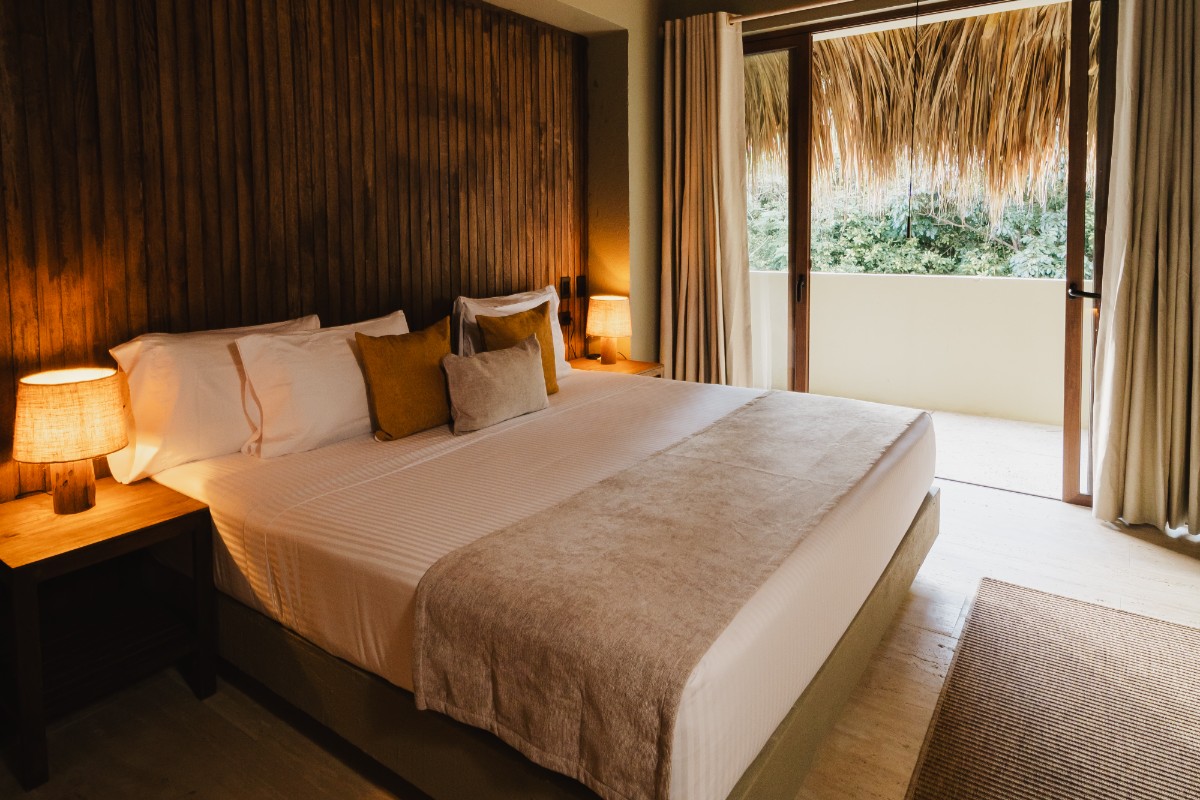 Con 267.8 m2 construidos y 140m2 de terraza exterior privada, con deck de madera, mobiliario, jacuzzi y una amplia piscina, además de un jardín de plantas nativas y tropicales construida con techo de palma. Se distribuye en dos niveles: en el primero, se encuentra una habitación, dotada con dos camas dobles, closet, baño privado, ventilador y aire acondicionado, además de área social con sofá, comedor 8 puestos, baño social, televisor pantalla plana, aire acondicionado, ventilador y amplia cocina dotada. En el segundo nivel está la habitación principal con cama King, televisor pantalla plana, aire acondicionado, ventilador, baño, closet y terraza privada con mobiliario. Adicional a esto, se cuenta con una habitación auxiliar con dos camas dobles, baño, aire acondicionado, ventilador y closet.