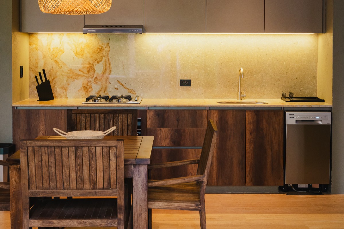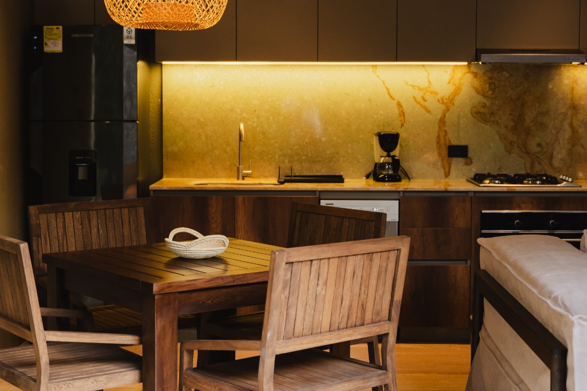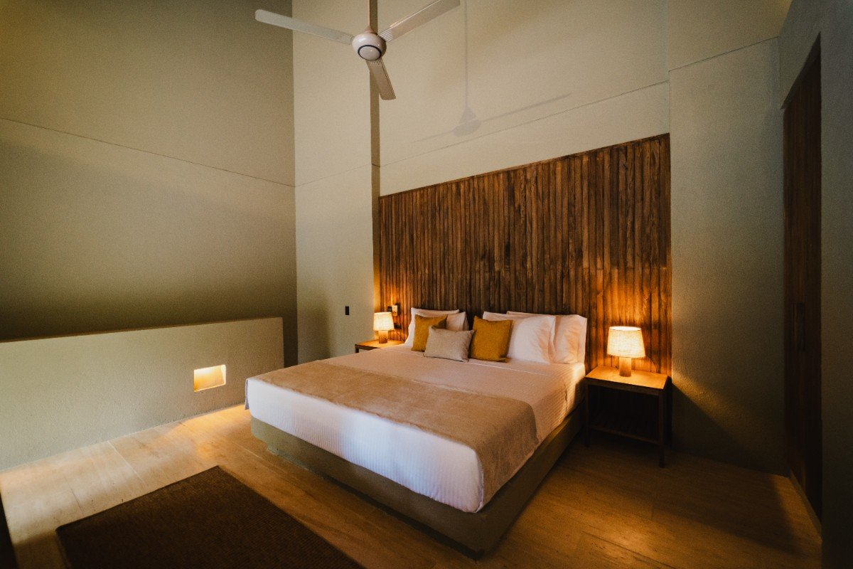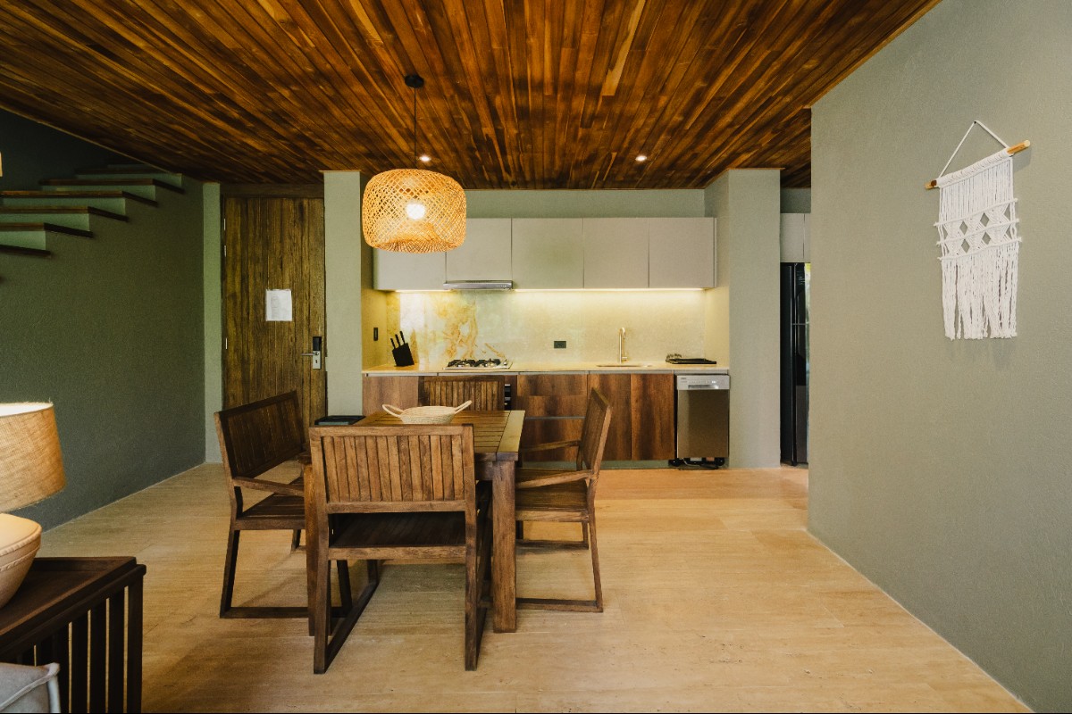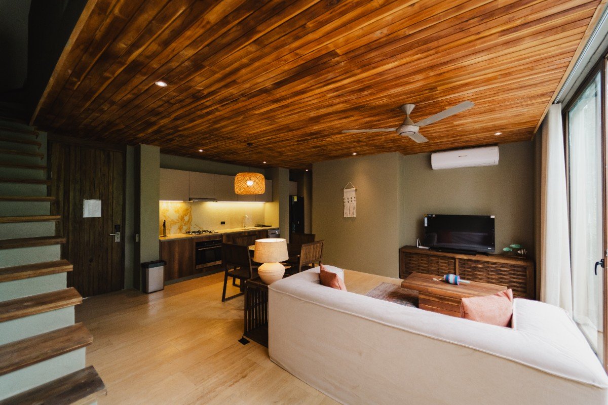 Con 70m2 interiores y 45m2 de terraza exterior privada, con deck de madera, mobiliario y una pequeña piscina, además de un jardín de plantas nativas y tropicales. Se distribuye en dos niveles: en el primero, se encuentra el área social con sofá, comedor 4 puestos, televisor pantalla plana, aire acondicionado, ventilador y cocina dotada. En el segundo nivel, está dispuesta la habitación principal con su baño cama king, aire acondicionado, ventilador, televisor pantalla plana y una terraza privada.