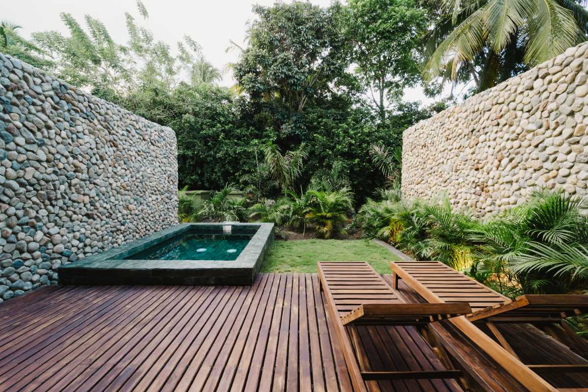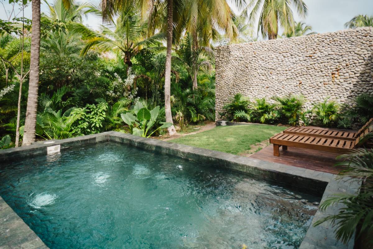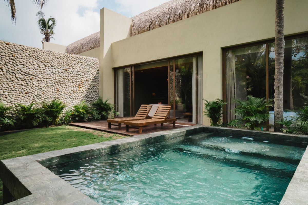 Con 100 m2 interiores y 56m2 de terraza exterior privada, con deck de madera, mobiliario y una piscina, además de un jardín de plantas nativas y tropicales. Se distribuye en dos niveles: en el primero, se encuentra una habitación, dotada con dos camas dobles, closet, ventilador y aire acondicionado, además de área social con sofá, comedor 4 puestos, televisor pantalla plana, aire acondicionado, ventilador y cocina dotada. En el segundo nivel está la habitación principal con cama King, televisor pantalla plana, aire acondicionado, ventilador, baño, closet y terraza privada con mobiliario.